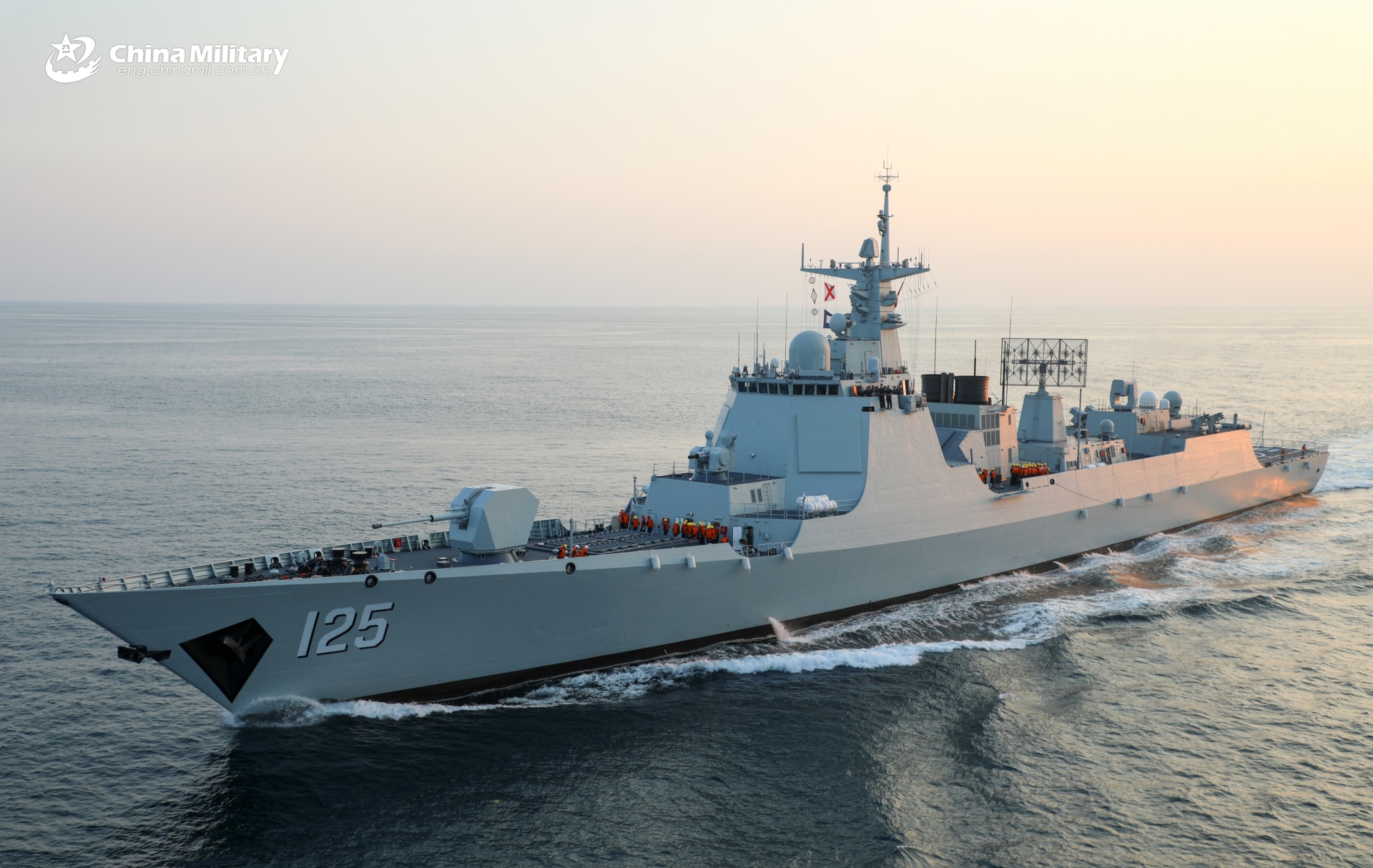 Type 052D guided-missile destroyer Cangzhou (Hull 125) attached to a training center with the navy under the Chinese PLA Northern Theater Command sails towards the designated waters during a maritime training exercise in early August, 2025. (www.xztyjl.com/Photo by Wang Lei)8月上旬,北部戰(zhàn)區(qū)海軍某艦艇訓(xùn)練中心開展海上訓(xùn)練。圖為艦艇航行。(英文中國軍網(wǎng)/王磊 攝)