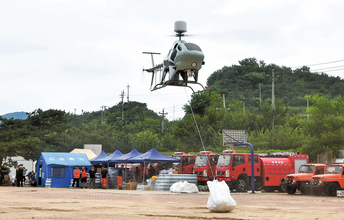 A drone is poised to deliver food and medicine to the flood-affected areas in Liudaohe town on Thursday. ZHAI YUJIA/CHINA NEWS SERVICE