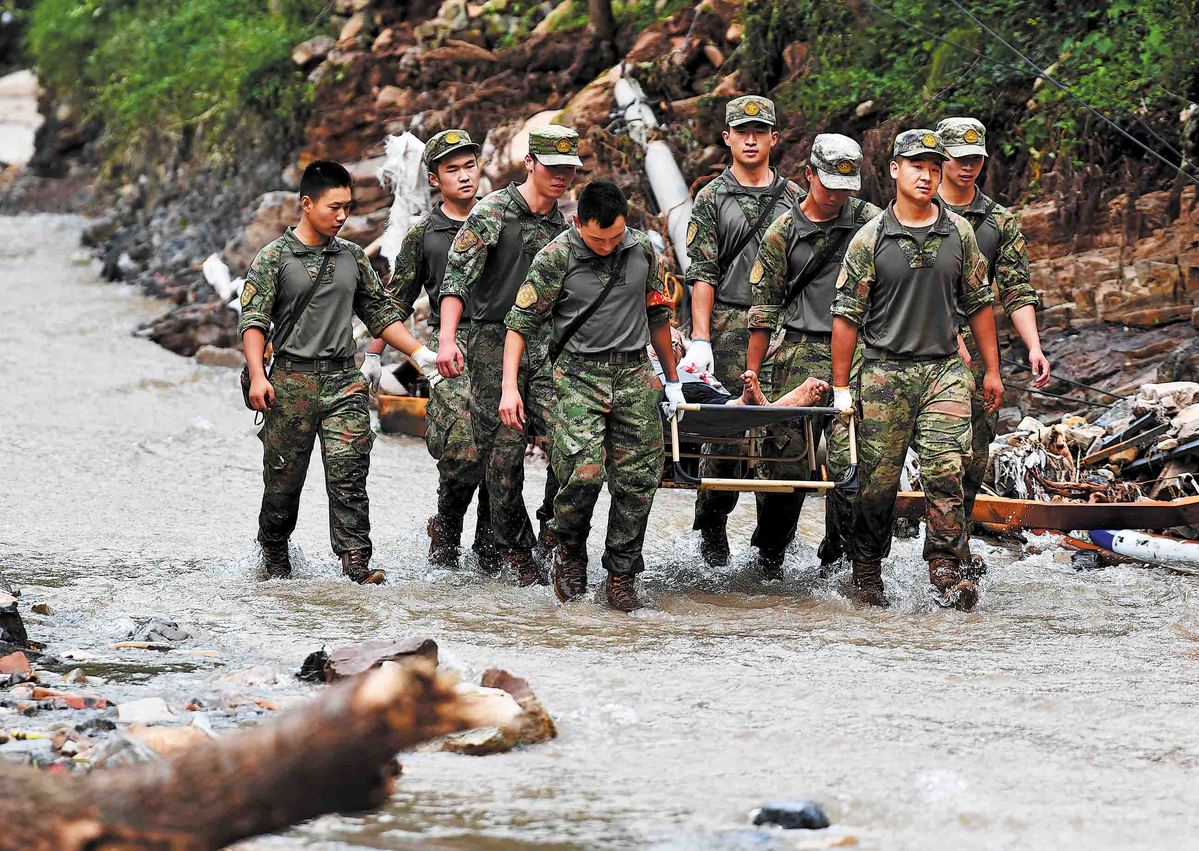 Rescuers from the People's Liberation Army help evacuate a wounded local in Xiangshuihu village in Liudaohe town, Hebei province, on Thursday. ZHAI YUJIA/CHINA NEWS SERVICE