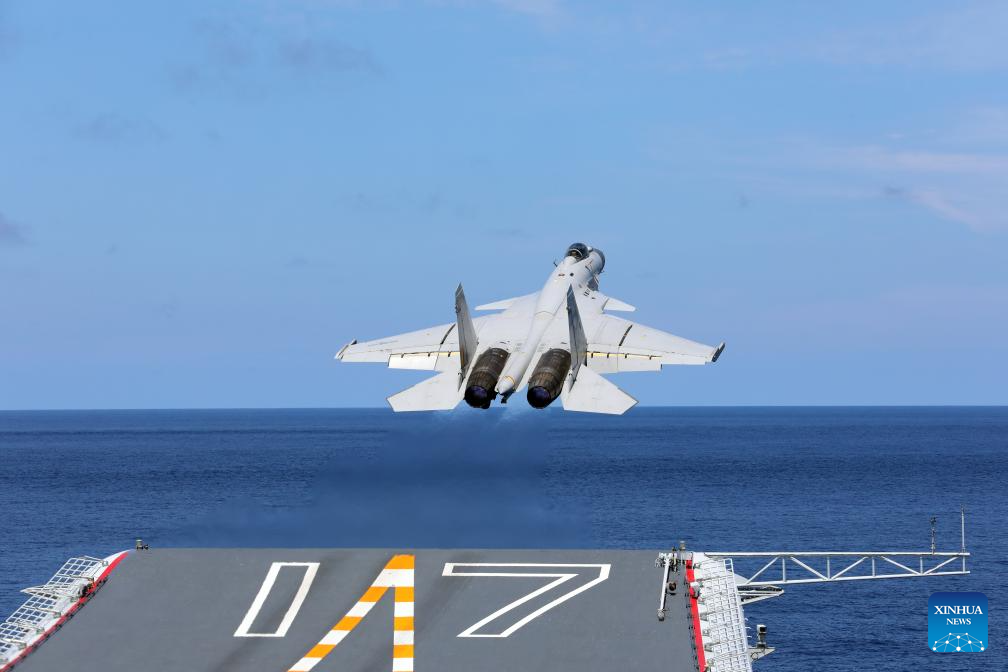 This photo shows a fighter jet taking off from an aircraft carrier. China's naval formations of two aircraft carriers, Liaoning and Shandong, have completed their far-sea combat-oriented training and safely returned to their home ports, according to the Chinese navy on Monday. (Photo by Wang Yuanlin/Xinhua)