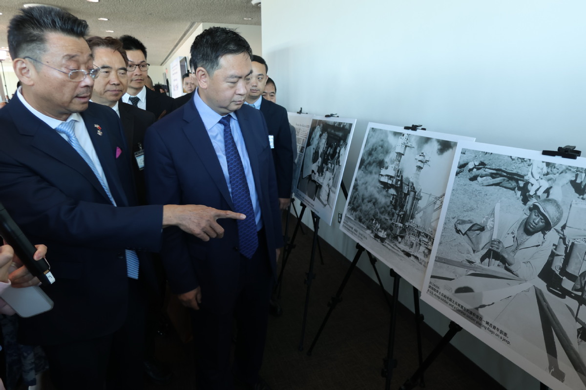 Asian American Community Empowerment (BRACE) chairman John Chan (left) and Chinese Consul General in New York Chen Li (right) attend a photo exhibition at the United Nations Headquarters to mark the 80th anniversary of both the founding of the UN and the victory in the global fight against fascism on Tuesday. Mingmei Li / China Daily