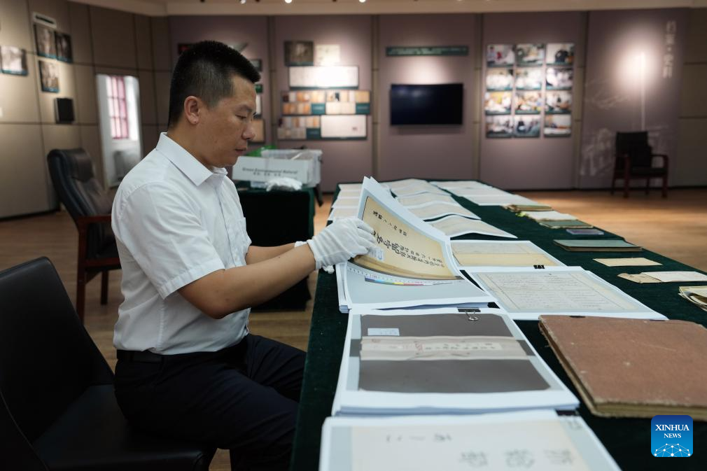 Jin Shicheng, a researcher with the Exhibition Hall of Evidences of Crime Committed by Unit 731 of the Japanese Imperial Army, puts the new evidence of Unit 731 in place at the hall in Harbin, northeast China's Heilongjiang Province, Aug. 13, 2025.