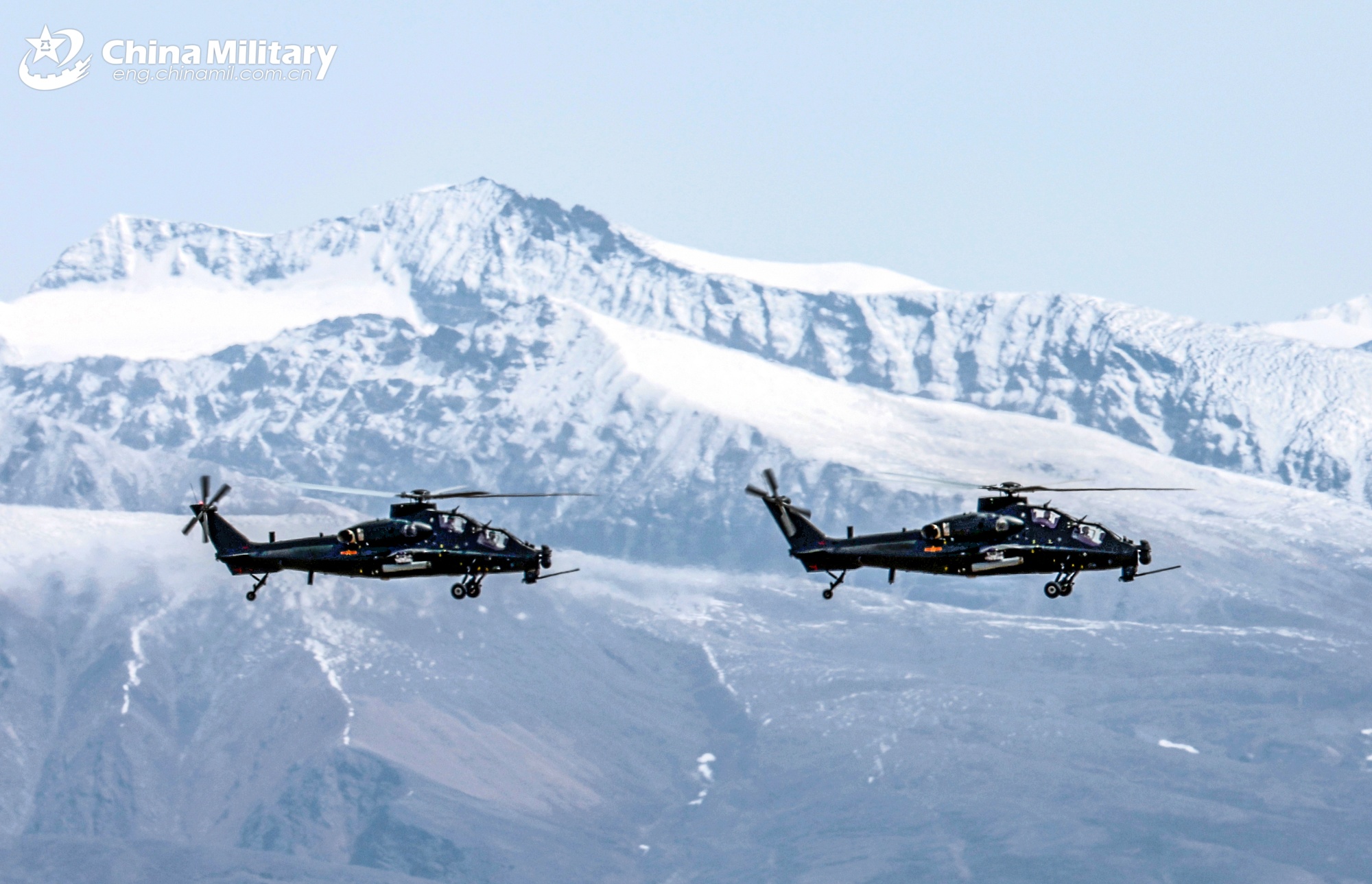 WZ-10 attack helicopters attached to a brigade under the Chinese PLA Xizang Military Command fly in formation during a flight training exercise on July 3, 2025. (www.xztyjl.com/Photo by Hu Qiwu)