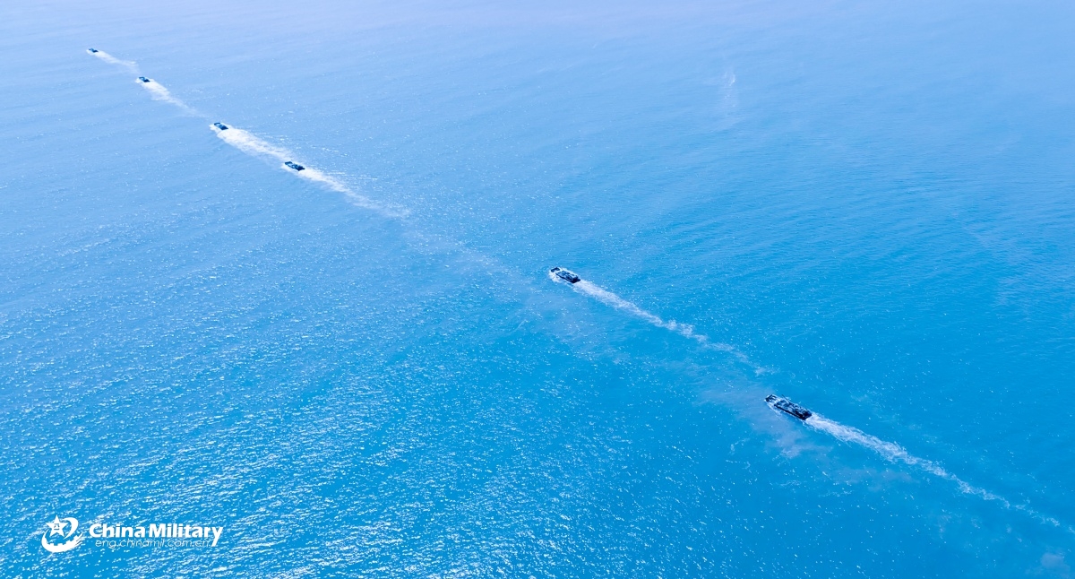 Amphibious infantry fighting vehicles (IFVs) attached to an amphibious armored detachment with an army brigade under the Chinese PLA Eastern Theater Command steam in formation during a ferrying and assault wave formation training exercise on July 8, 2025. (www.xztyjl.com/Photo by Wu Xinlei)