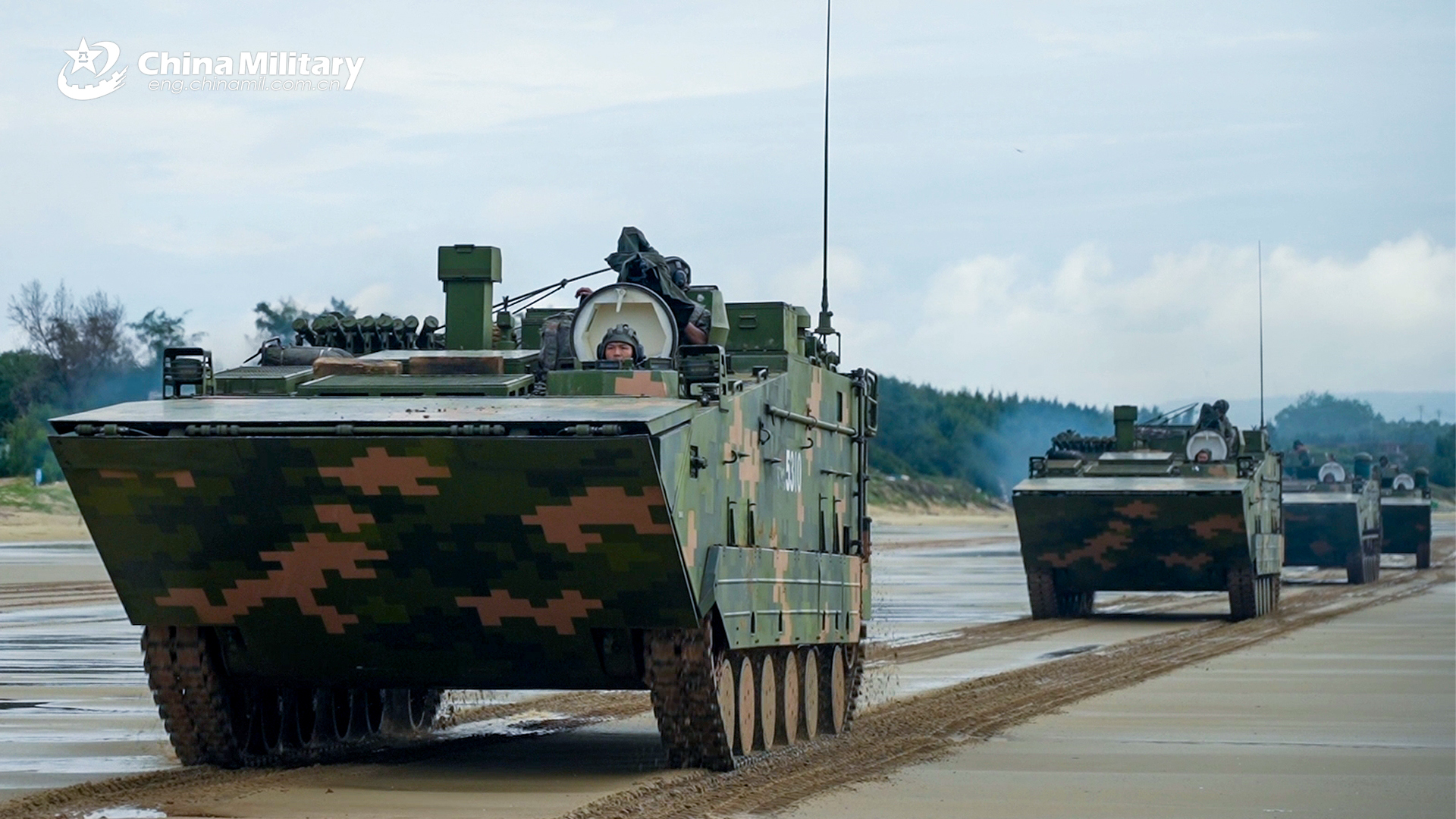 Amphibious infantry fighting vehicles (IFVs) attached to an amphibious armored detachment with a brigade under the Chinese PLA Army maneuver towards the designated sea area during a ferrying and assault wave formation training exercise. (www.xztyjl.com/Photo by Ma Hailin)