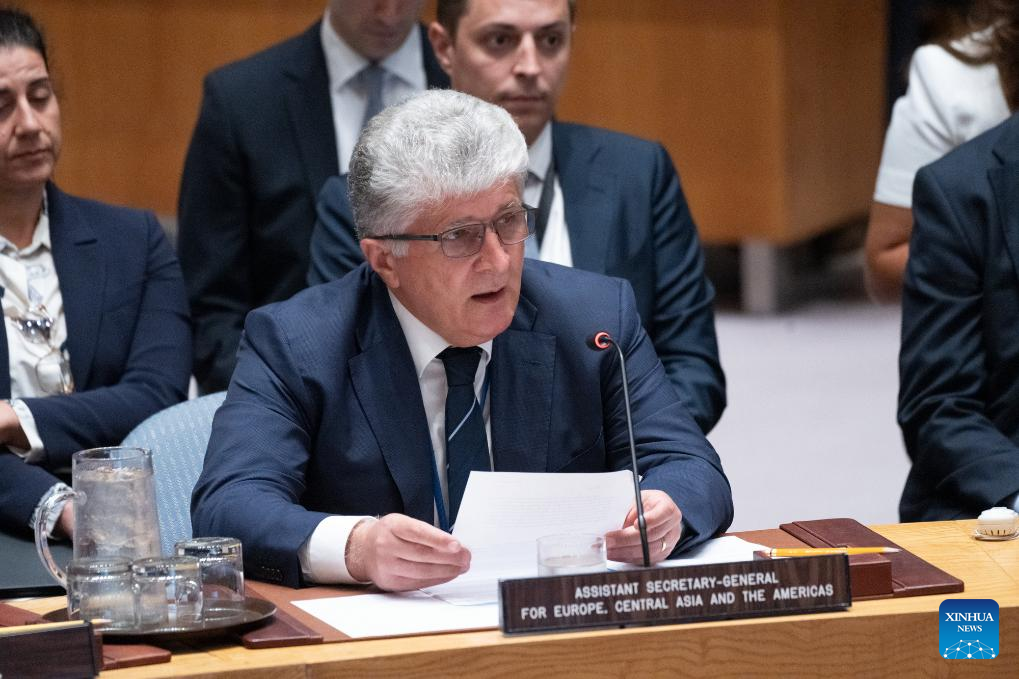 UN Assistant Secretary-General for Europe, Central Asia and the Americas Miroslav Jenca (Front) speaks at a Security Council meeting at the UN headquarters in New York, on Aug. 5, 2025. Jenca on Tuesday warned against the possible expansion of Israeli military operations through the Gaza Strip. (Evan Schneider/UN Photo/Handout via Xinhua)