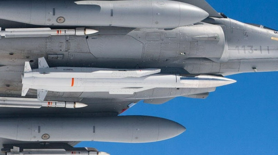 A Rafale fighter jet carries an ASMP-A air-launched nuclear missile under its fuselage.