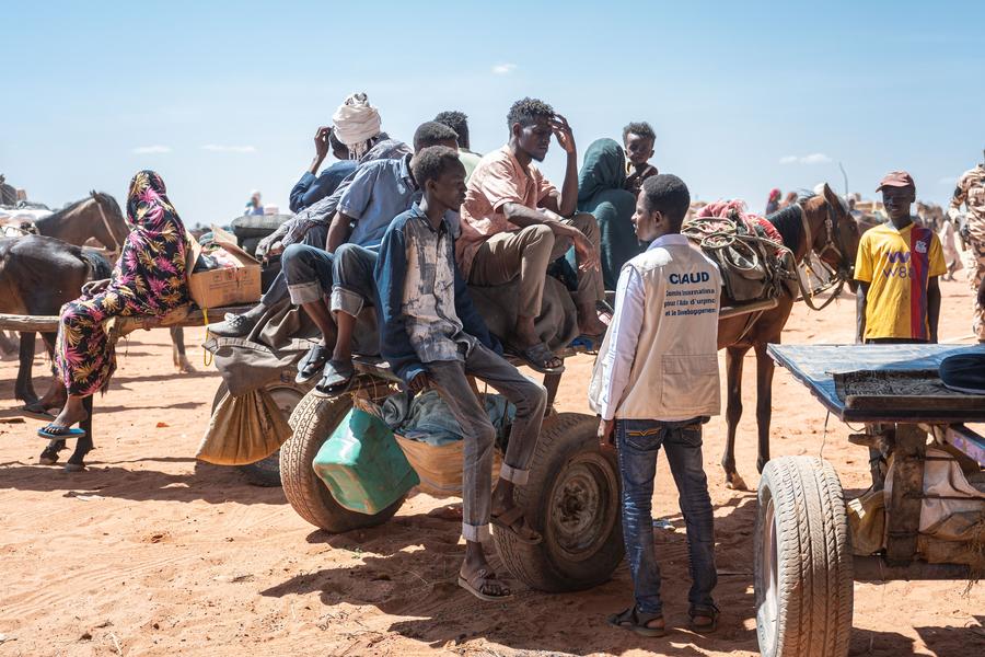 Sudanese refugees talk with a staff member from CIAUD at the entry point in Adre, Chad, on June 24, 2025. According to the statistic figures released by the UN earlier in June, more than 844,000 Sudanese refugees have fled to Chad after war broke out in Sudan in April 2023. (Xinhua/Wang Guansen)