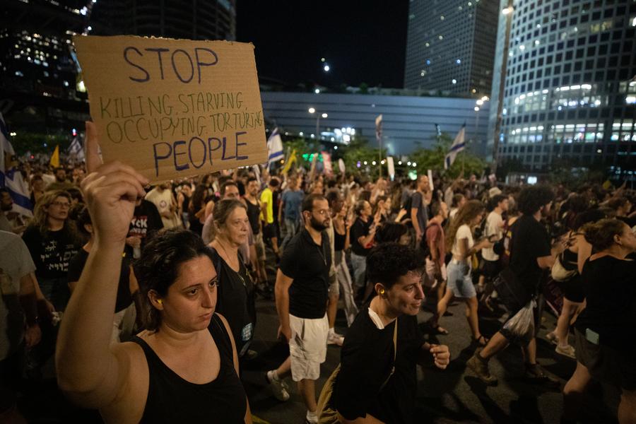 People take part in a rally in Tel Aviv, Israel, Aug. 17, 2025. Tens of thousands of Israelis demonstrated on the day, demanding that Prime Minister Benjamin Netanyahu secure a deal with Hamas to end the Gaza war. (Xinhua/Chen Junqing)