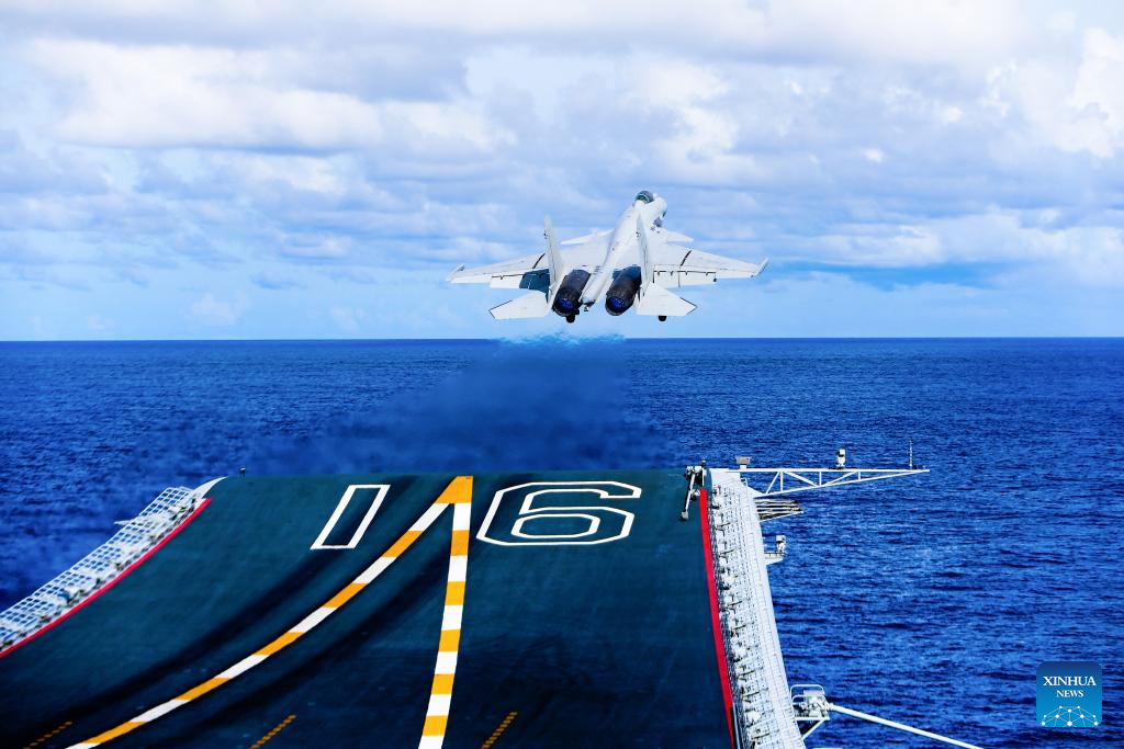 This photo shows a fighter jet taking off from an aircraft carrier. China's naval formations of two aircraft carriers, Liaoning and Shandong, have completed their far-sea combat-oriented training and safely returned to their home ports, according to the Chinese navy on Monday. (Photo by Wang Yuanlin/Xinhua)
