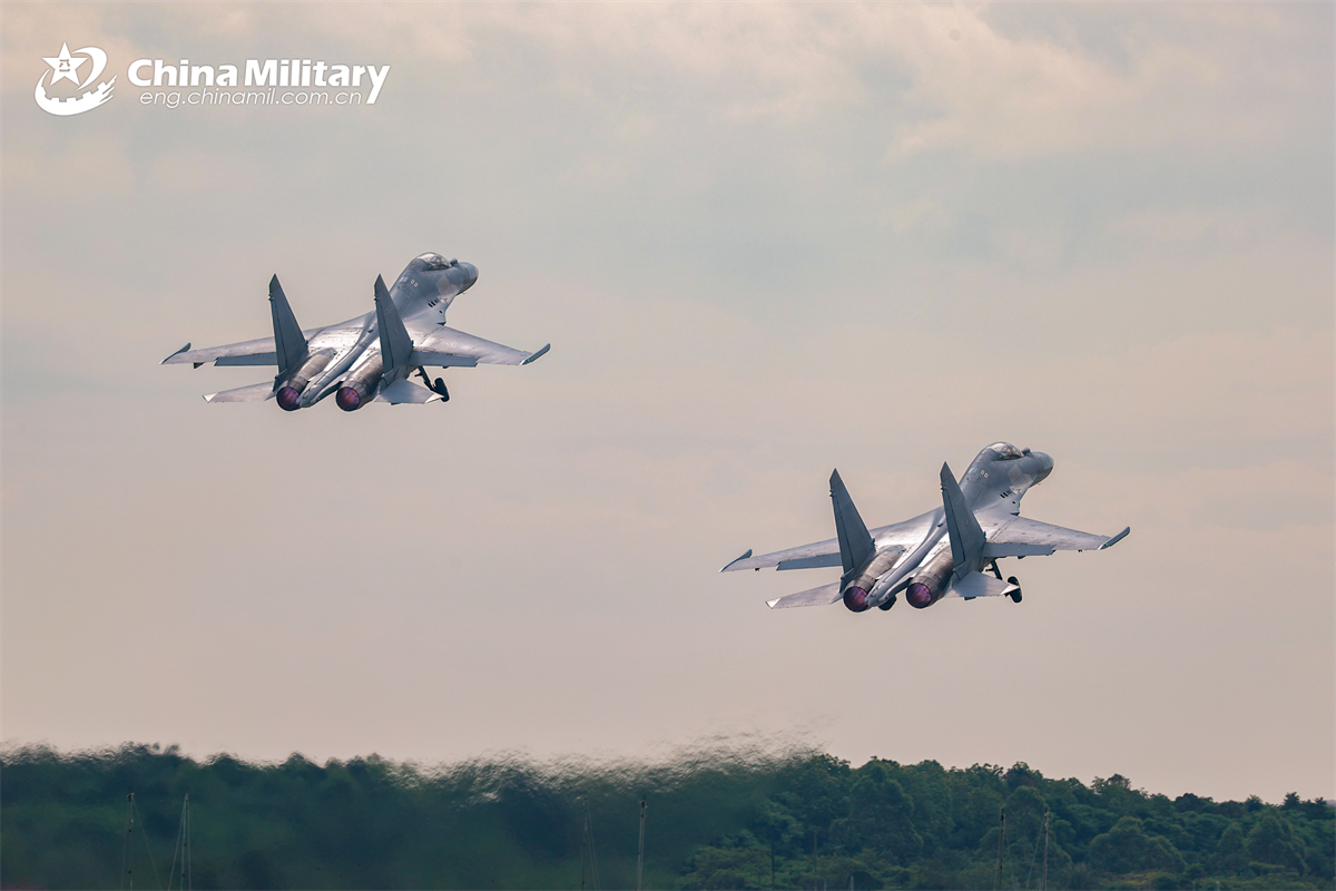 Two J-16 multi-role fighter jets attached to a unit under the Chinese PLA Air force take off during a close range air-combat training exercise. (xztyjl.com/Photo by Wang Xinwei)