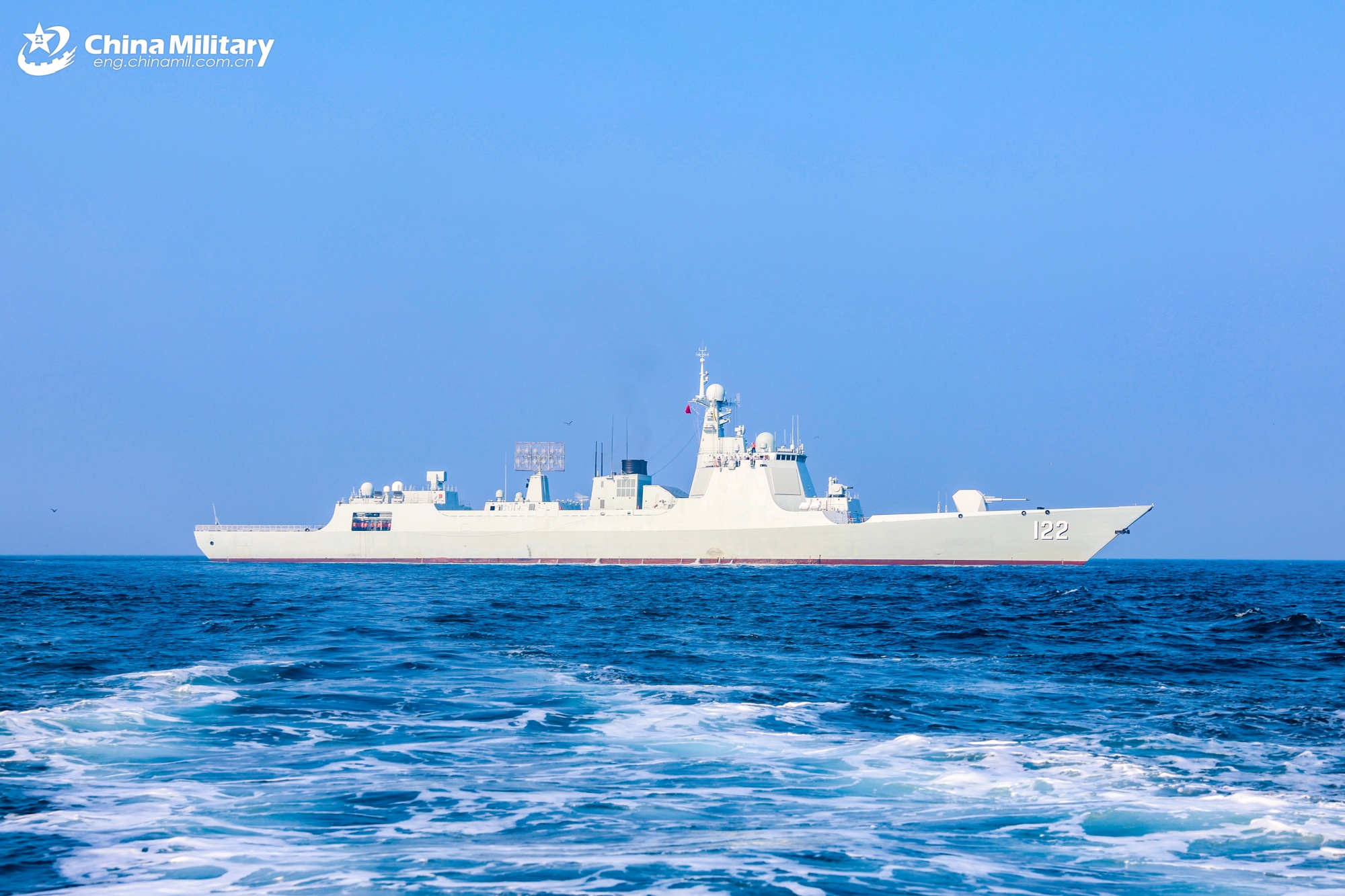 The guided-missile destroyer Tangshan (Hull 122) attached to a flotilla with the navy under the Chinese PLA Northern Theater Command sails on the sea during a maritime training exercise held recently. (xztyjl.com/Photo by Ma Yubin)